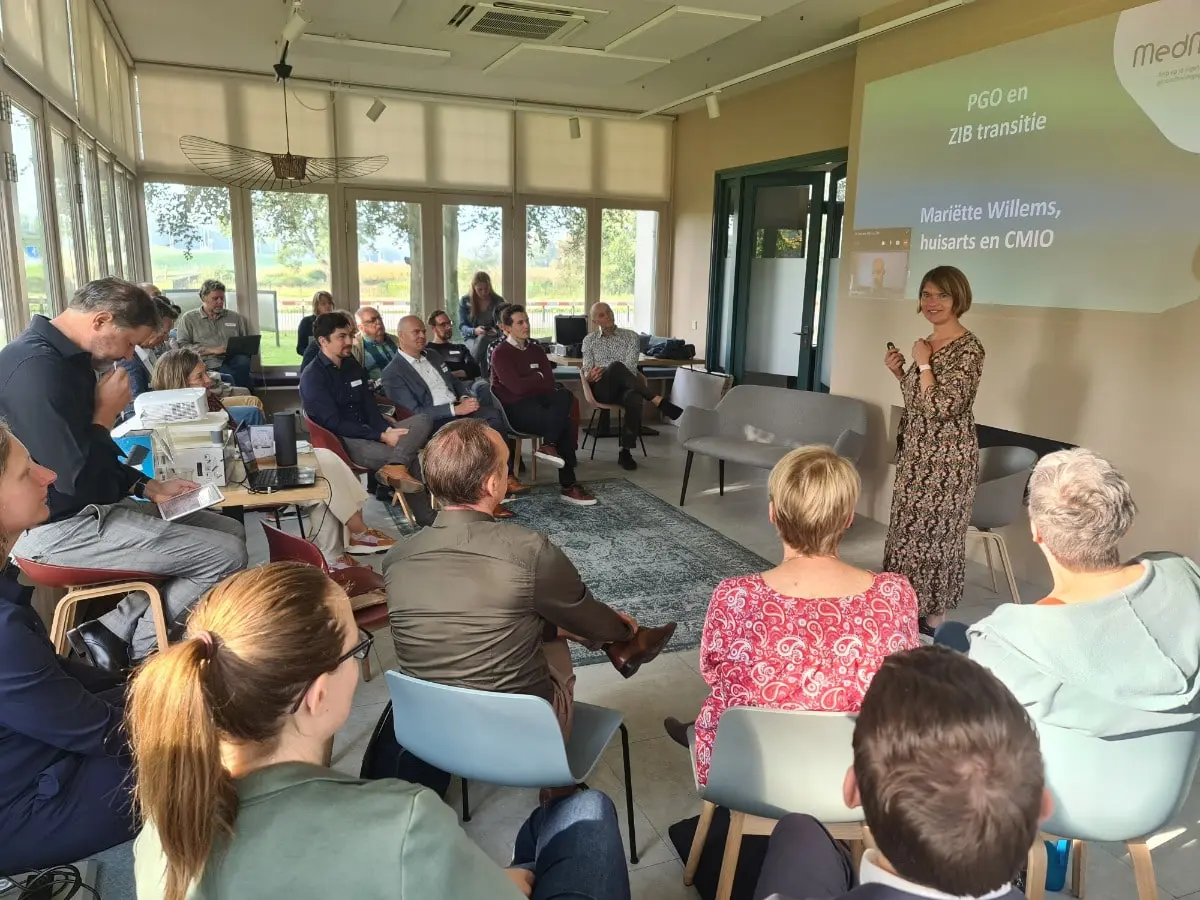 Zoals gebruikelijk ging het inhoudelijke programma daarna verder in een plenaire setting met externe inbreng, georganiseerd door Mariëtte Willems. Zij is huisarts en CMIO en betrokken bij MedMij. Haar statement was dat als we een beeld willen hebben van hoe het er voor staat met het delen en hergebruiken van informatie uit verschillende bronnen, het een goed idee is om te kijken hoe het er voor staat met de praktijk van de PGO’s. In dat kader had ze twee PGO leveranciers uitgenodigd in de personen van Hans Niendieker van Ivido en Esther van Noort van Curavista/Gezondheidsmeter. Beide waren online aanwezig en presenteerden de mogelijkheden die hun PGO’s bieden, hoe zich dat verhoudt tot de (toepassing van) zibs en waar ze tegenaan lopen en verbetermogelijkheden zien. Dat leidde tot interessante discussies en inzichten. Gelukkig was het weer prachtig weer zodat de discussie voortgezet kon worden in de pauze met een kop koffie of thee in het zonnetje buiten.